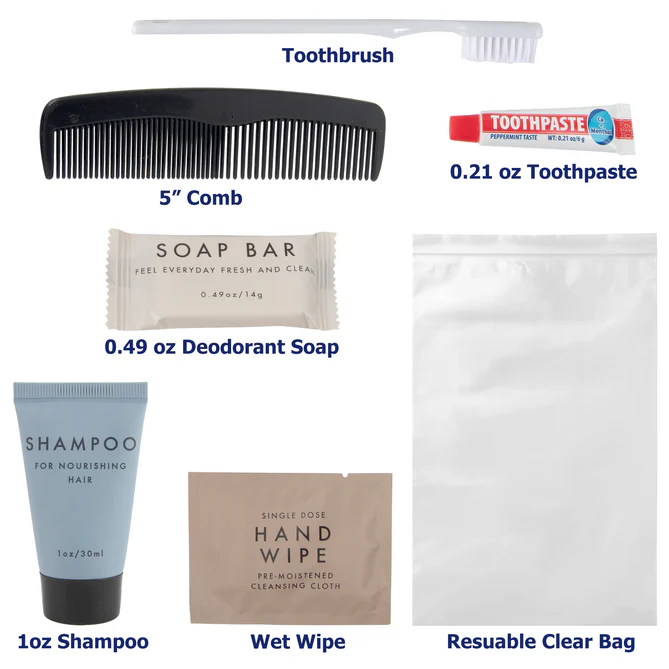 Each basic travel hygiene kit is individually packed with the following supplies: