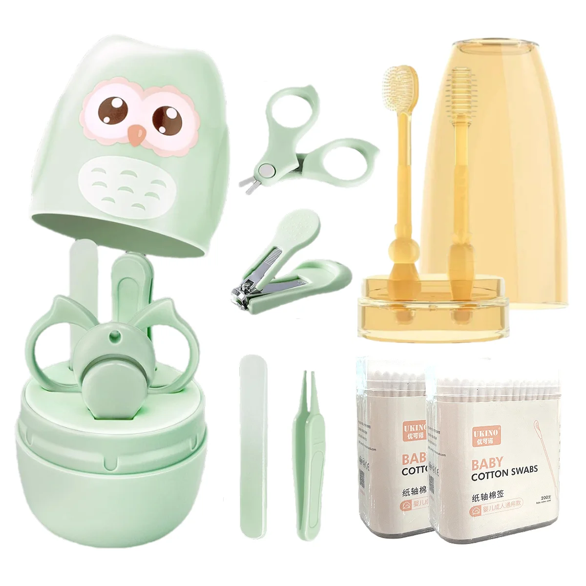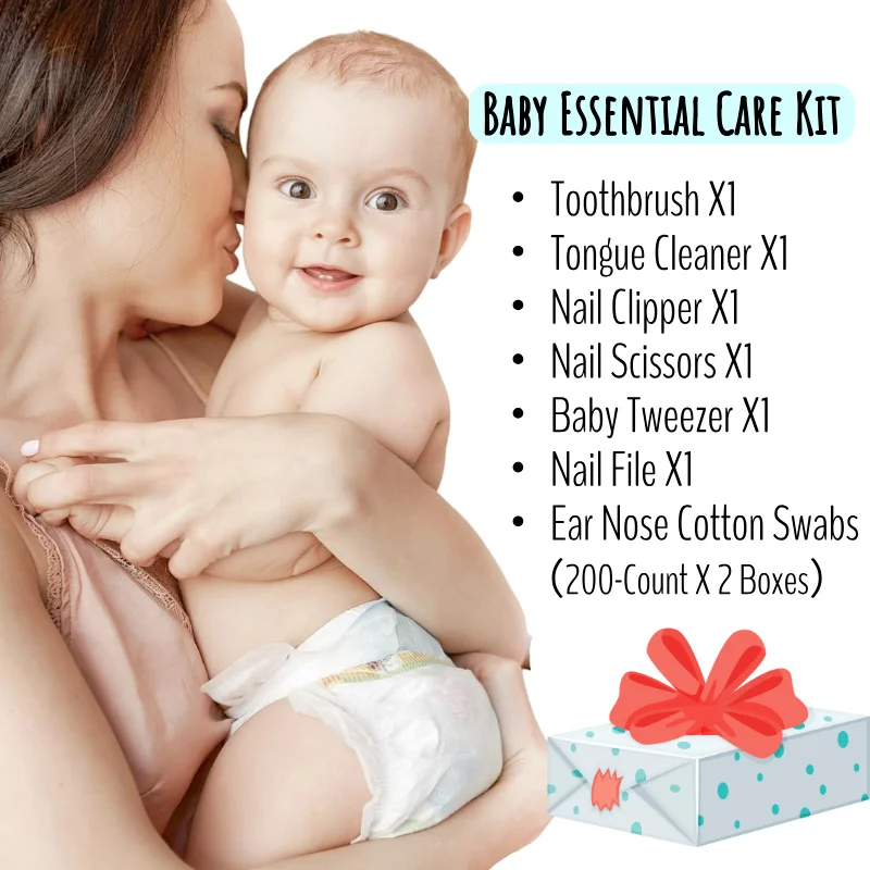 This essential care kit includes a tongue cleaner, gum brush, nail trimmer set, and ear swabs, providing a comprehensive solution for baby hygiene.