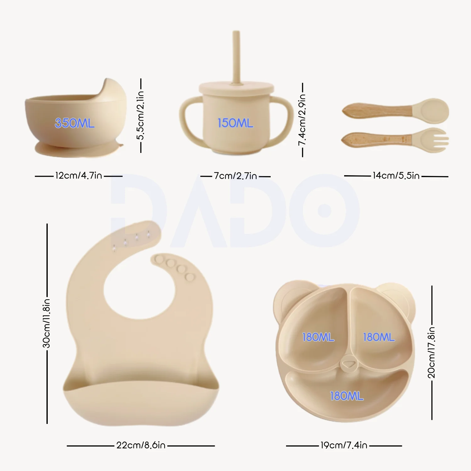 [CUSTOM BABIES’ NAME ON THE DISHES SET]—We will print the logo and your baby’s name on all of the silicone plates, bowls, cups, and other tableware. Safe and eco-friendly logo printing technology ensures that the set is safe for babies. The logo and name will never fade after production.
