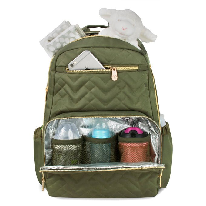 Our Olive Fisher-Price Signature Morgan Backpack Diaper Bag has spacious compartments and a stylish design. It is made with premium materials, giving both practicality and sophistication and ultimately keeping your baby’s essentials organized. It features a front zipper pocket and 2 side stretch pockets to fit bottles and powder. padded laptop compartment, internal, secure, and zippered section for pacifiers, snacks, and keys. Easy to wipe clean with a gentle soapy cloth, water-resistant outer polyester canvas. The diaper bag measures 17″ X 12.5″ X 6.5″.Â