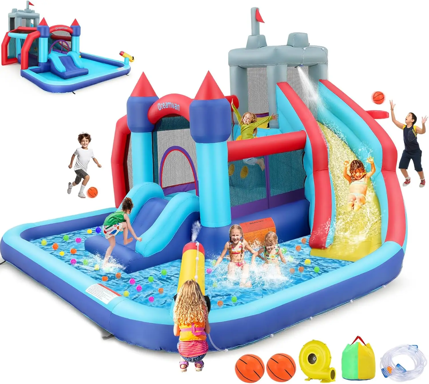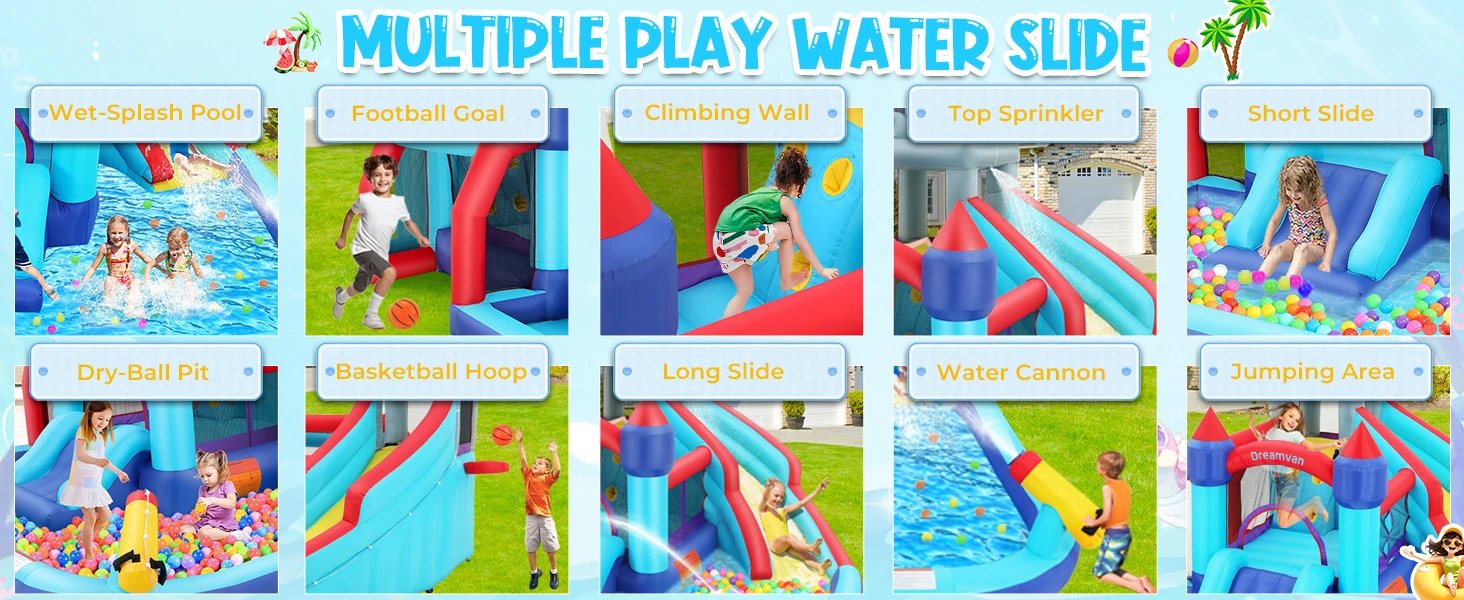 1. 💦 Ultimate 10-In-1 Sports Waterpark: Transform your backyard into an action-packed water playground! Features basketball hoop, soccer goal, dual slides (long splash slide & short slide), bounce area, climbing wall, sprinkler tunnel, splash pool/ball pit, and water cannon. Perfect for active kids who love sports and water play!