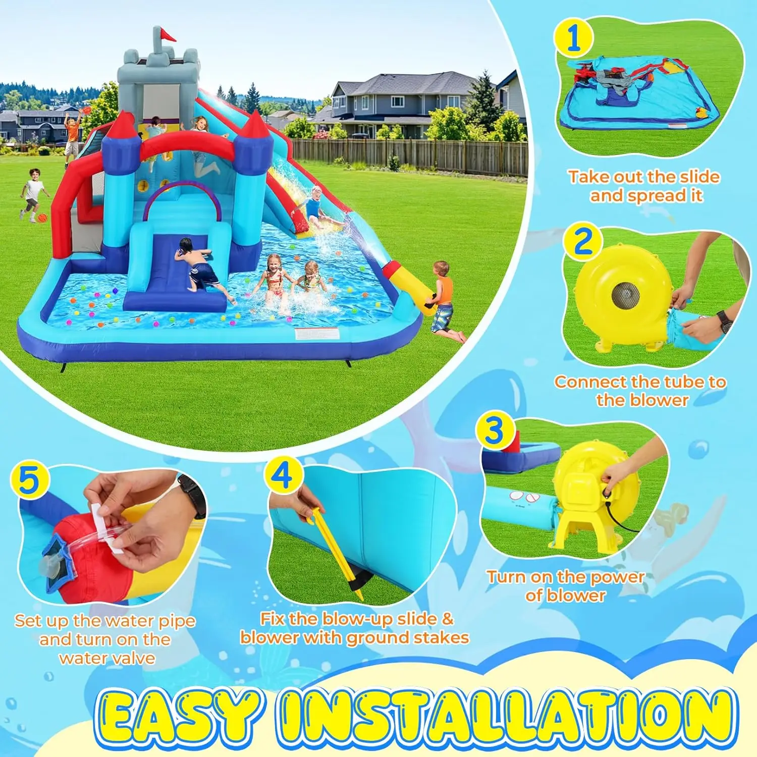 5. 💦Premium Safety & Complete Set: Features protective mesh netting for safe play. INCLUDES: Inflatable slide, 580W blower, 2 inflatable balls, water tube, 8 stakes, carry bag, repair kit & manual.