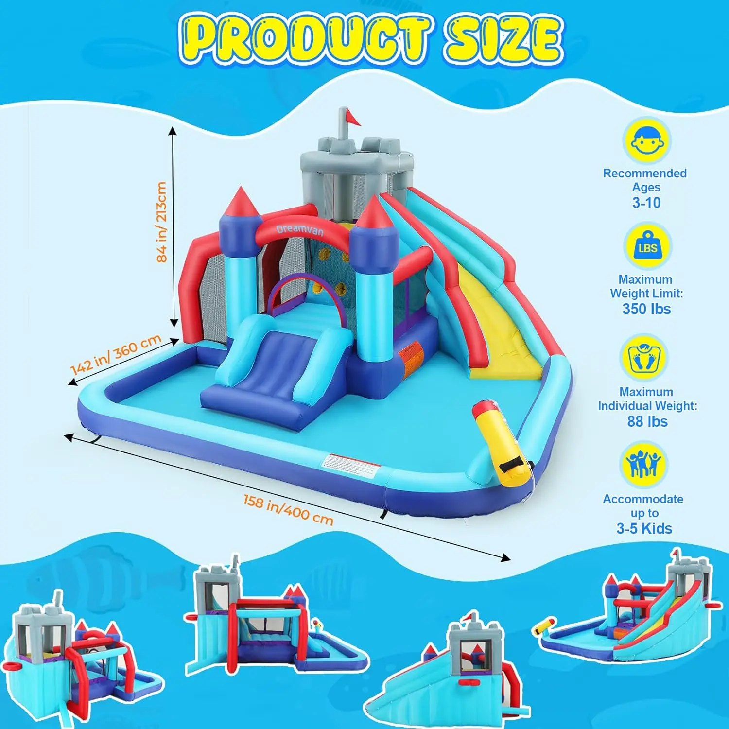 3. 💦Year-Round Fun for Kids 3-10: Designed for children ages 3-10, this amazing play center features exciting water slides, climbing adventures, sports activities, and splash zones all in one awesome setup. Measuring 13 x 11.8 x 7 feet (158x142x84inch), weighing just 53 pounds, and supporting up to 350 pounds, it’s the perfect size for backyard fun.
