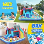 2. 💦Sports & Splash Combo: Perfect blend of sports and water play! Kids can practice their soccer skills, shoot some hoops(includes 2 sports balls), or cool off on the water slide. The multi-activity design keeps multiple children entertained for hours while developing athletic skills. Best of all, it’s versatile – use it as a water park on sunny days or convert it to an indoor ball pit when the weather doesn’t cooperate!